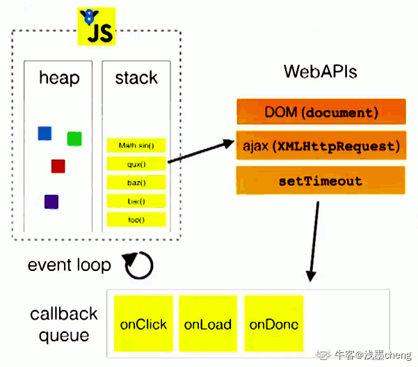 那么,单线程就意味着,所有任务需要排队,前一个任务结束才会执行后一个任务,所以为了提高CPU的利用效率,就把所有任务分成了同步任务(synchronous)和异步任务(asynchronous),同步任务在主线程顺序执行,异步任务则不进入主线程而是进入到任务队列(task queue)中。在主线程上会形成一个执行栈,等执行栈中所有任务执行完毕之后,会去任务队列中查看有哪些事件,此时异步任务结束等待状态,进入执行栈中,开始执行。