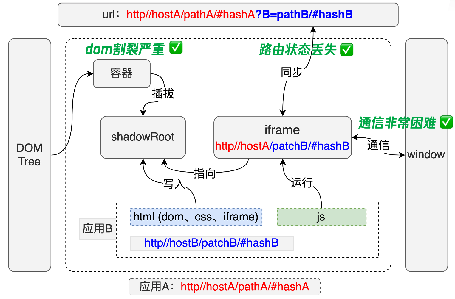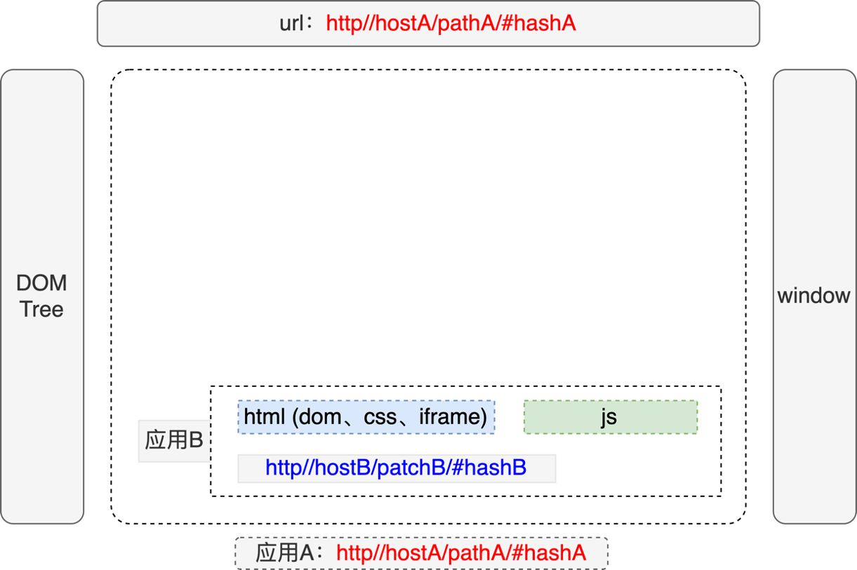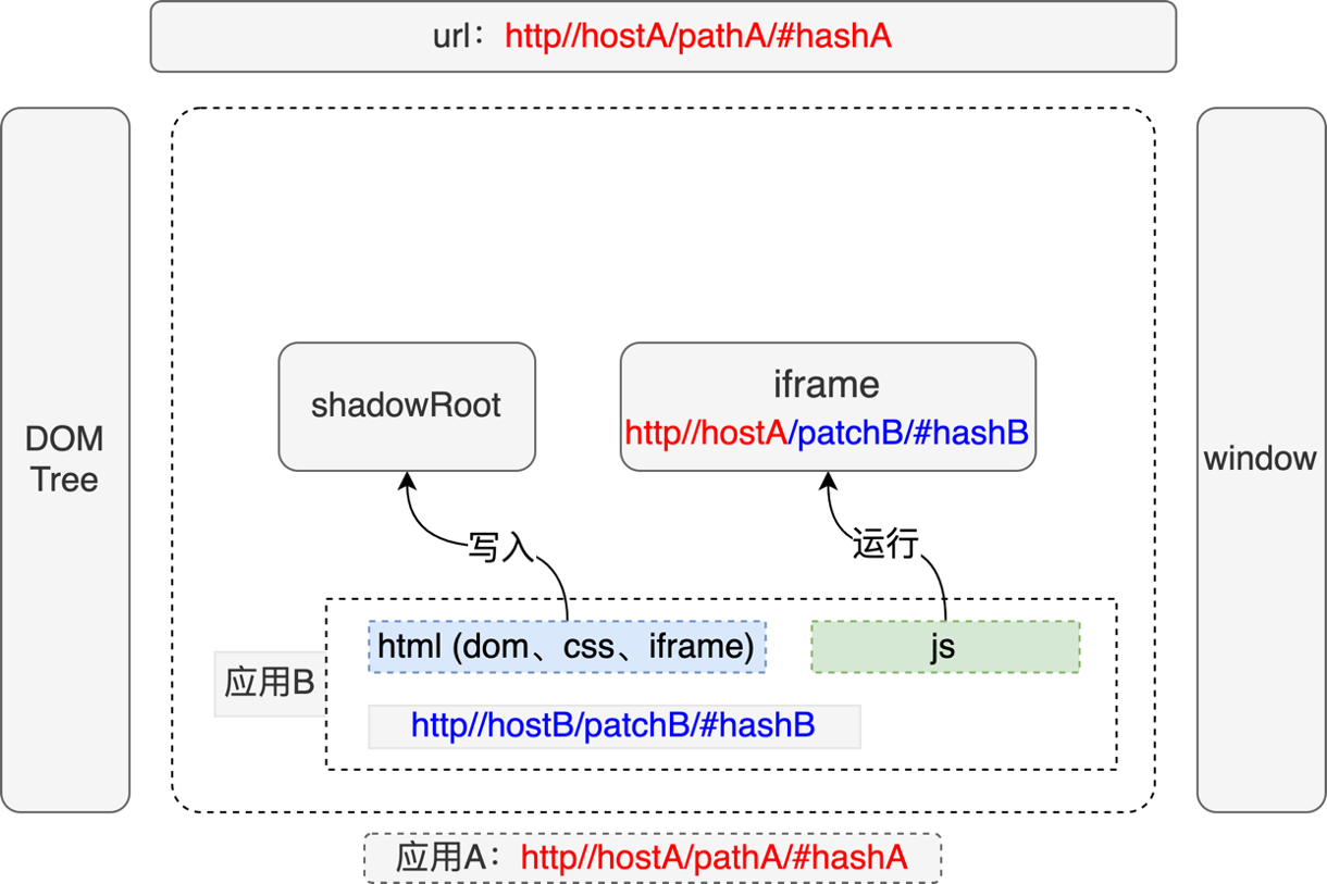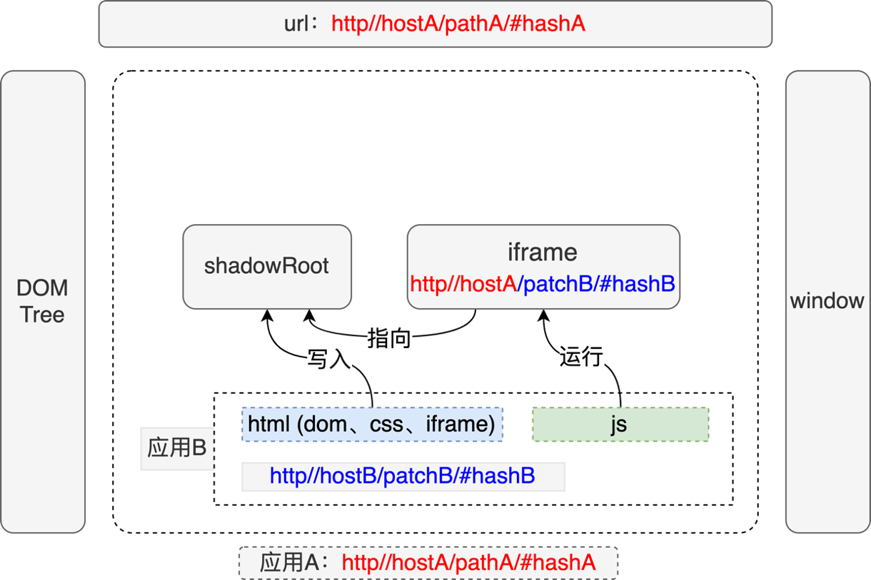 在应用A中构造一个shadowiframe,然后将应用B的html写入shadow中,js运行在iframe中,注意iframeurliframe保持和主应用同域但是保留子应用的路径信息,这样子应用的js可以运行在iframelocationhistory中保持路由正确
