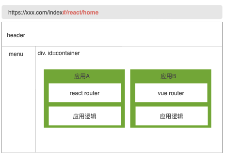 上图中主应用加载子应用时也告知了子元素的 dom 元素可以渲染到 #container div 中。所有子应用的路由都会去监听 url 的 hash 值,并改变要展示的内容,这里要自己避免子应用间的冲突,比如两个子应用都被激活,最后把内容都渲染到 #container 中了。