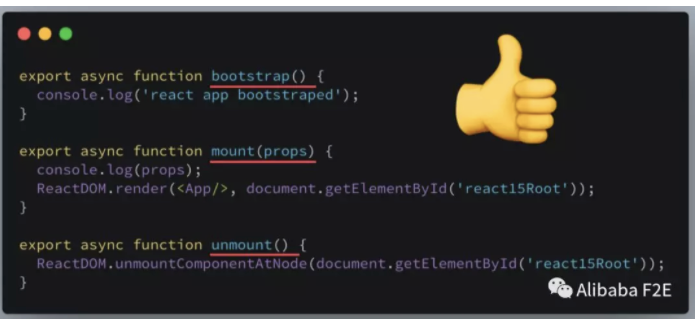 写 react 应用,会有一句 ReactDOM.render(<App/>, document.querySelector('#app')) 来渲染到 DOM 上,但上面所说,要让 single-spa 使用,需要提供 mount/unmount,这个渲染并附加到 DOM 上的时机让 single-spa 来控制,而不是一加载 js 就执行。需要改成如下写法:
