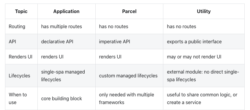 上面是 single-spa 定义的微前端的种类,通常 Application 和 Parcel 两种方式我们见的较多;Utility 这一类见的较少,一般通过 monorepository 或者 npm 包方式可以解决。