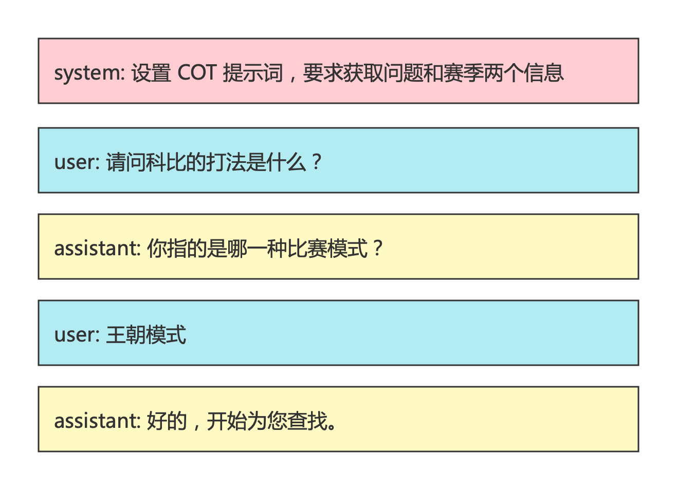 • 利用思维链(Chain-Of-Thought, COT)提示的能力,提供范本,让 LLM按样例和用户进行交互,将问题逐步完善,直到获取足够的信息为止。以游戏 NBA2K为例,球员的打法在不同比赛模式中是不同的,比如王朝 5v5和街头 3v3就不一样。用户可能并未意识到这一点,希望LLM 能够自动和玩家交互直到获得:问题和比赛模式两个信息,再进行处理。细节可以参考知乎的文章ChatGPT 系列教程—提问篇:Prompt 的高级概念,本文不再赘述。这里仅提供一个示例,告知 ChatGPT 使用案例中的样式和玩家交互: