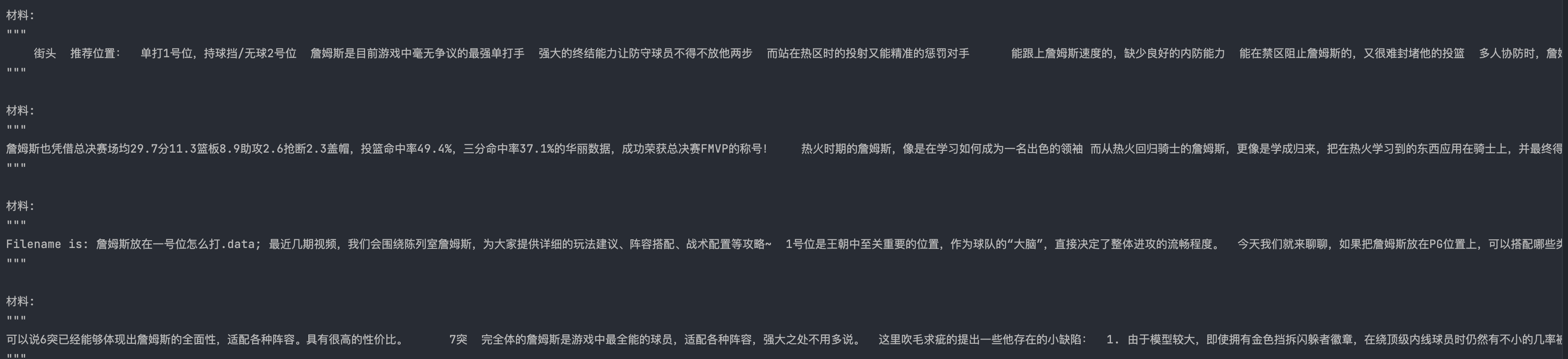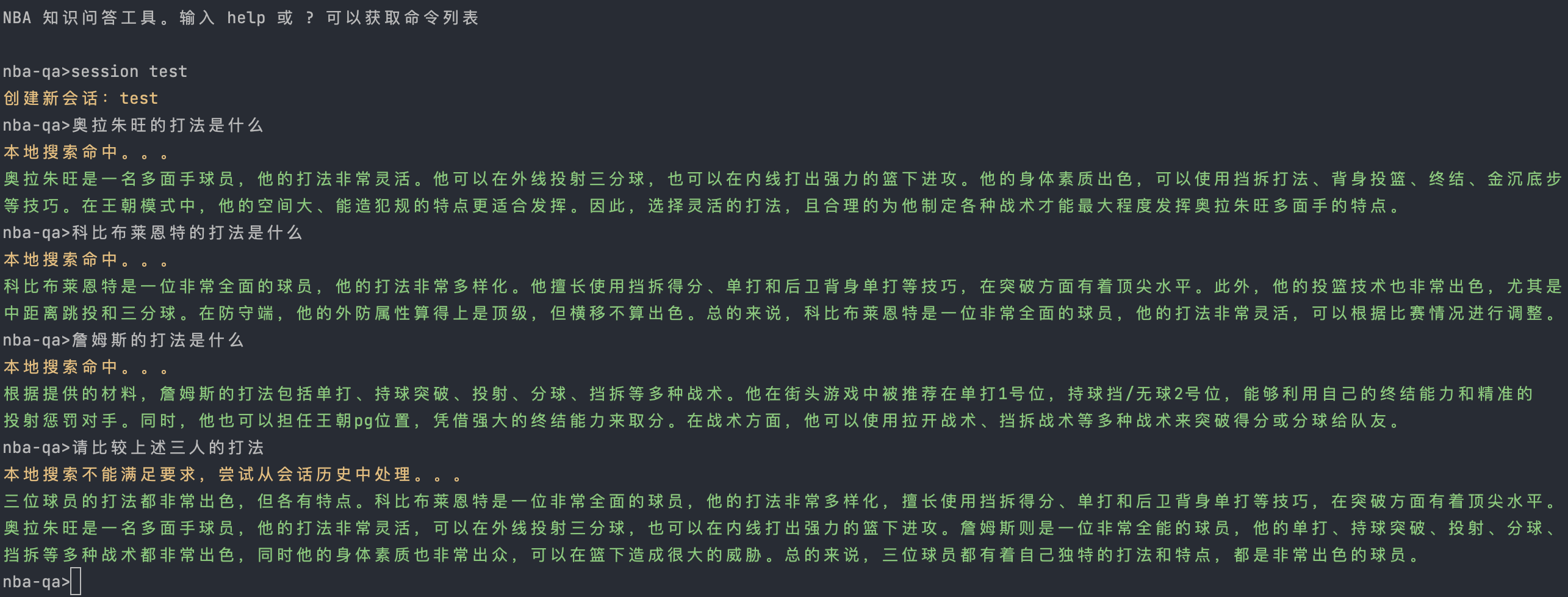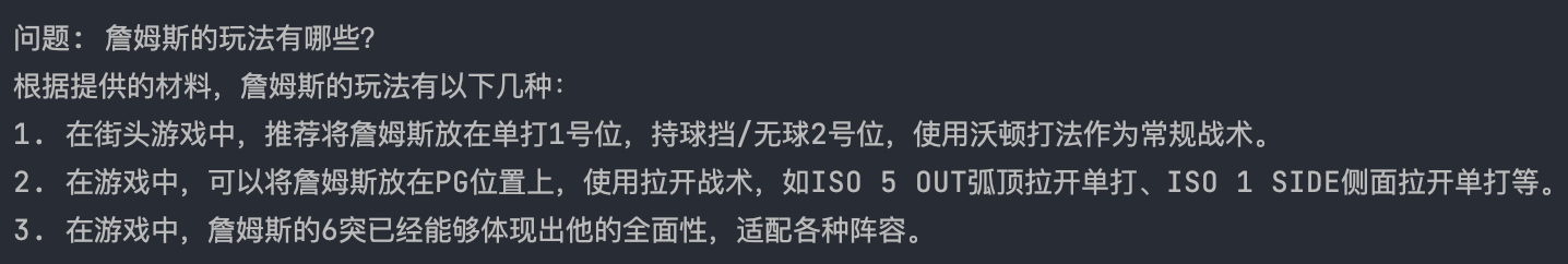 上述方案在测试过程中,以 NBA2K Online2 官网的攻略信息为基础进行尝试,基于 OpenAI API,搭建简单的 CLI 的应用。效果如下所示(为了简化过程,一律省略多轮交互问答的过程)。