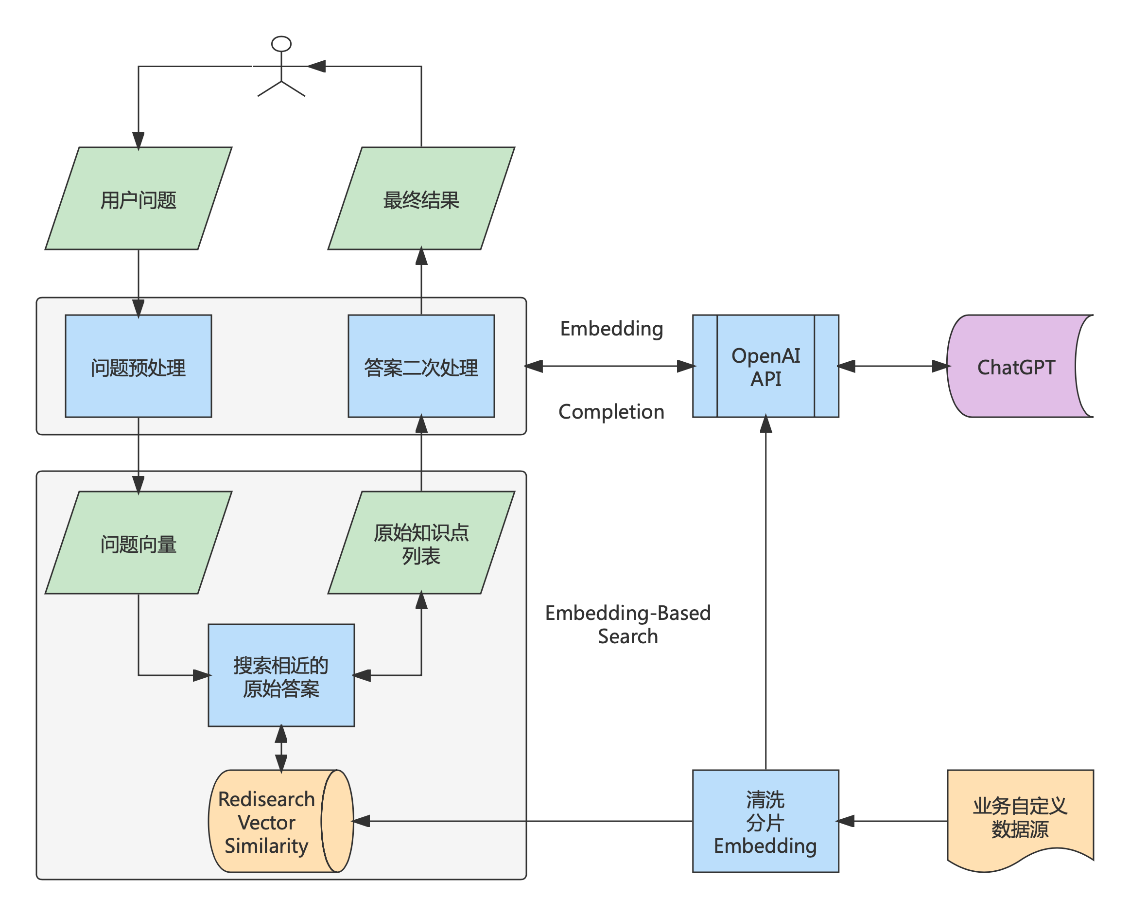 本文的实现,参考了 OpenAI 提供的样例,主要理由是 ChatGPT 对外提供了良好的 API 以及中英文支持。但从框架角度而言,不会绑死在OpenAI 上,每一个具体实现都可以由业务结合自己的需求进行替换。上节提到的方案落地到 ChatGPT 上特化为: