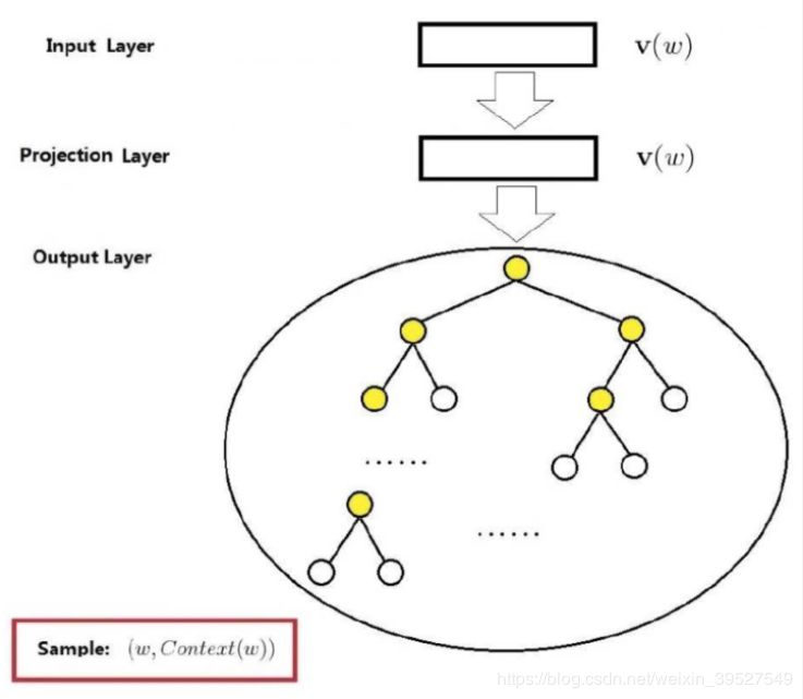 Hierarchical Softmax对原模型的改进主要有两点,第一点是从输入层到隐藏层的映射,没有采用原先的与矩阵W相乘然后相加求平均的方法,而是直接对所有输入的词向量求和。假设输入的词向量为(0,1,0,0)和(0,0,0,1),那么隐藏层的向量为(0,1,0,1)。