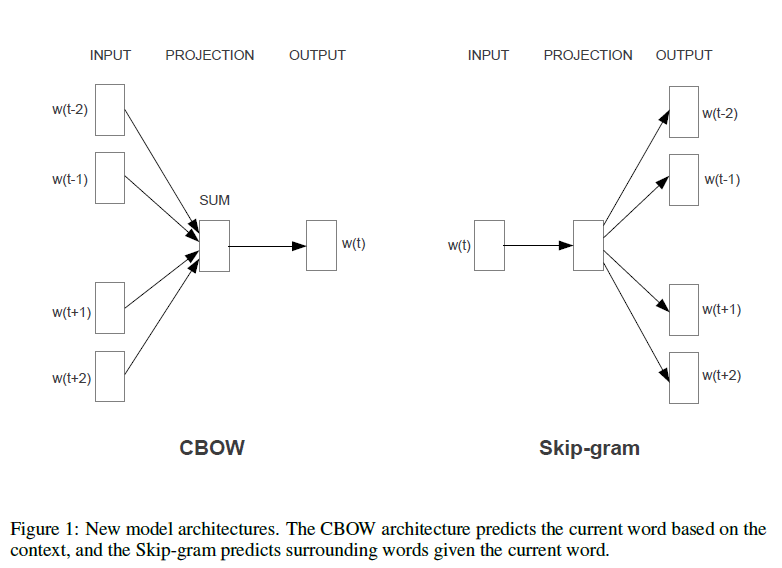 Google的Mikolov在关于Word2Vec的论文中提出了CBOW和Skip-gram两种模型,CBOW适合于数据集较小的情况,而Skip-Gram在大型语料中表现更好。其中CBOW如下图左部分所示,使用围绕目标单词的其他单词(语境)作为输入,在映射层做加权处理后输出目标单词。与CBOW根据语境预测目标单词不同,Skip-gram根据当前单词预测语境,如下图右部分所示。假如我们有一个句子“There is an apple on the table”作为训练数据,CBOW的输入为(is,an,on,the),输出为apple。而Skip-gram的输入为apple,输出为(is,an,on,the)。
